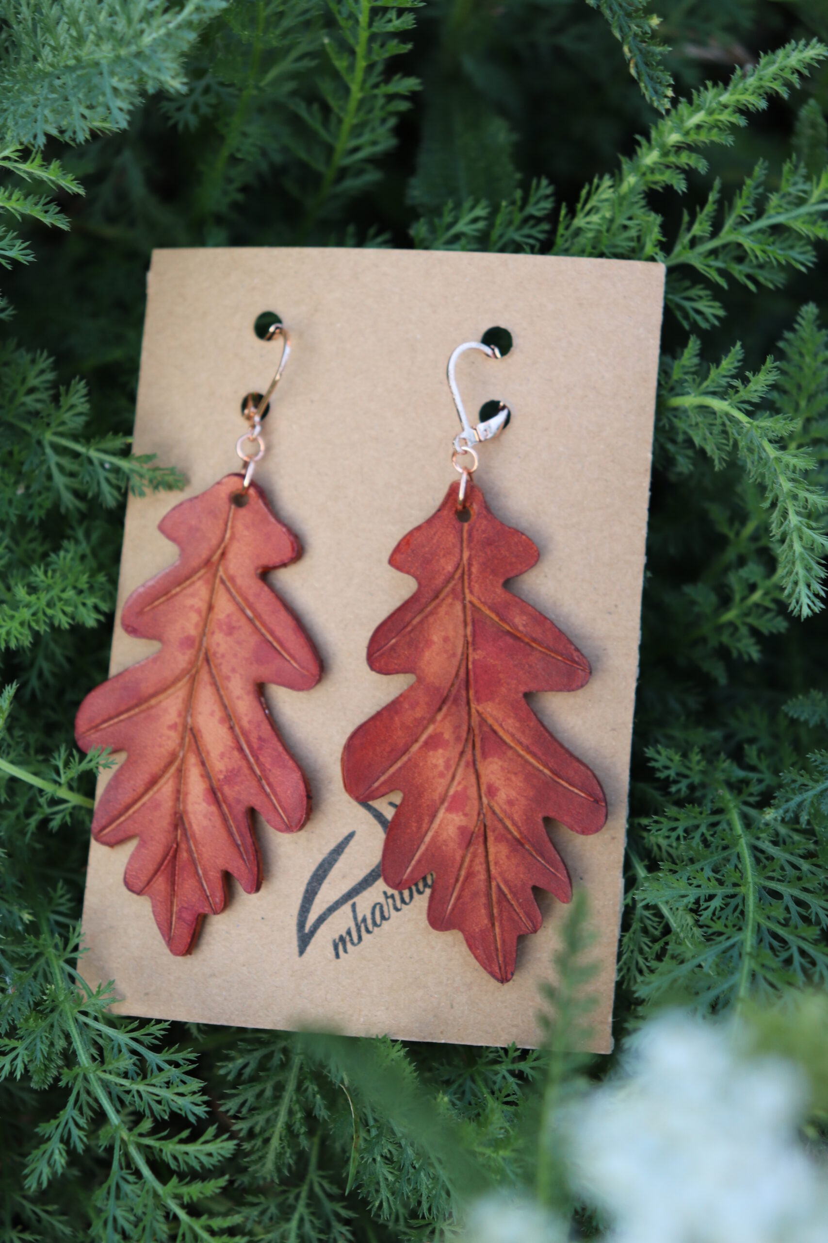 Leather earrings in the shape of leaves from ancient oaks, with gold-colored surgical steel hooks, will adorn elves, dryads, and other lovers of the magic of nature.