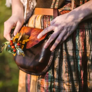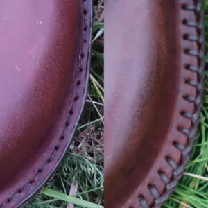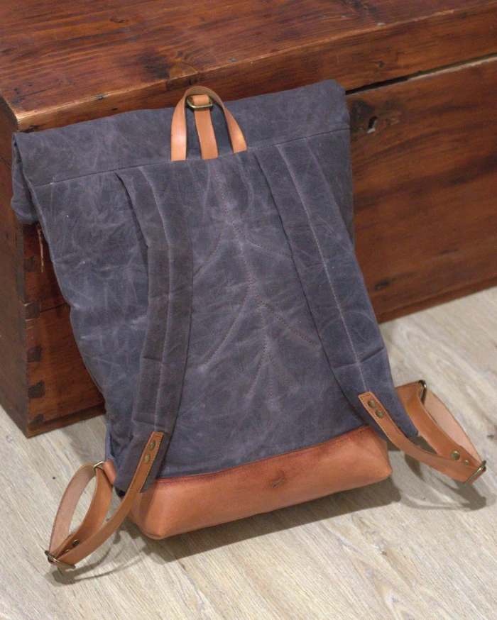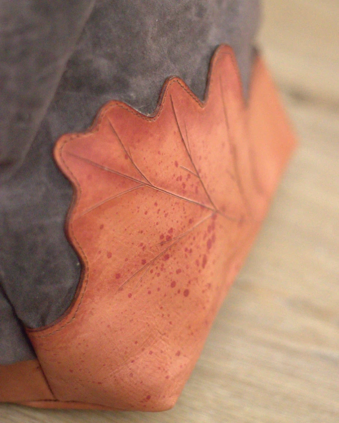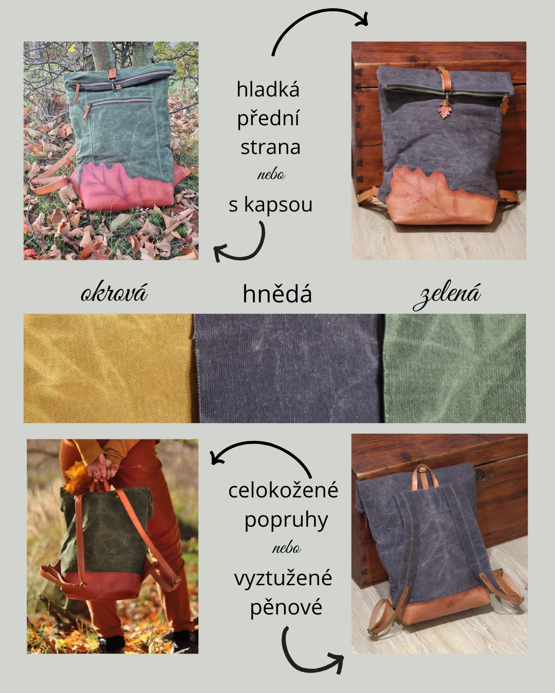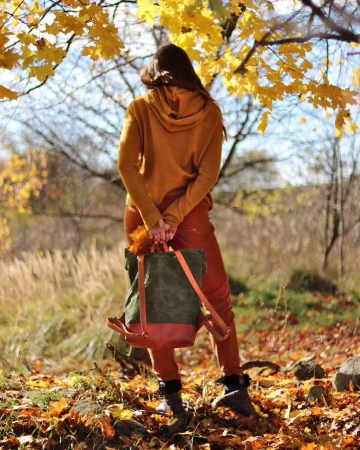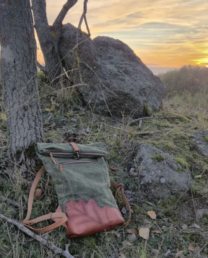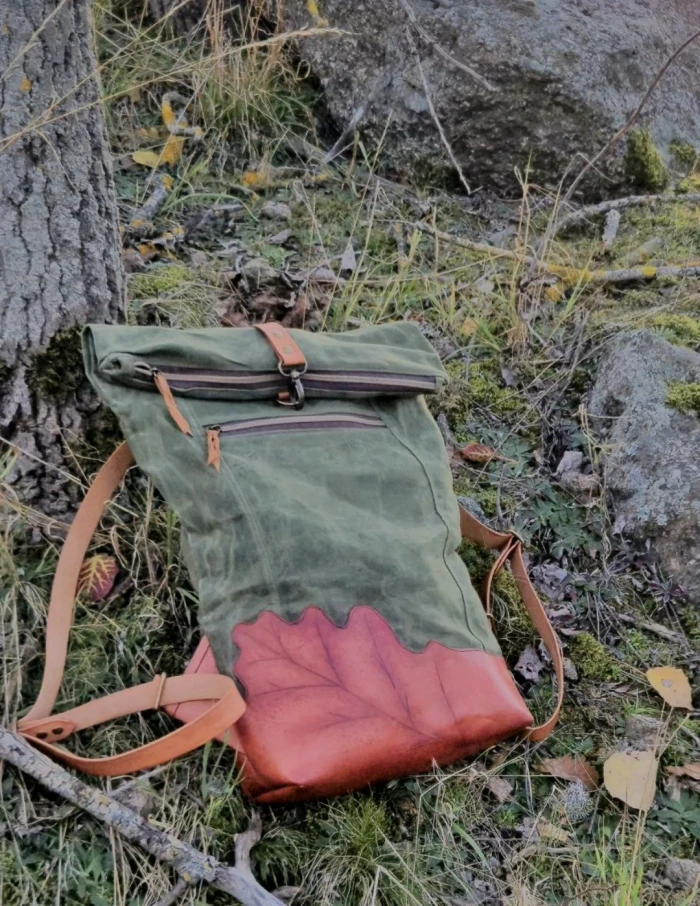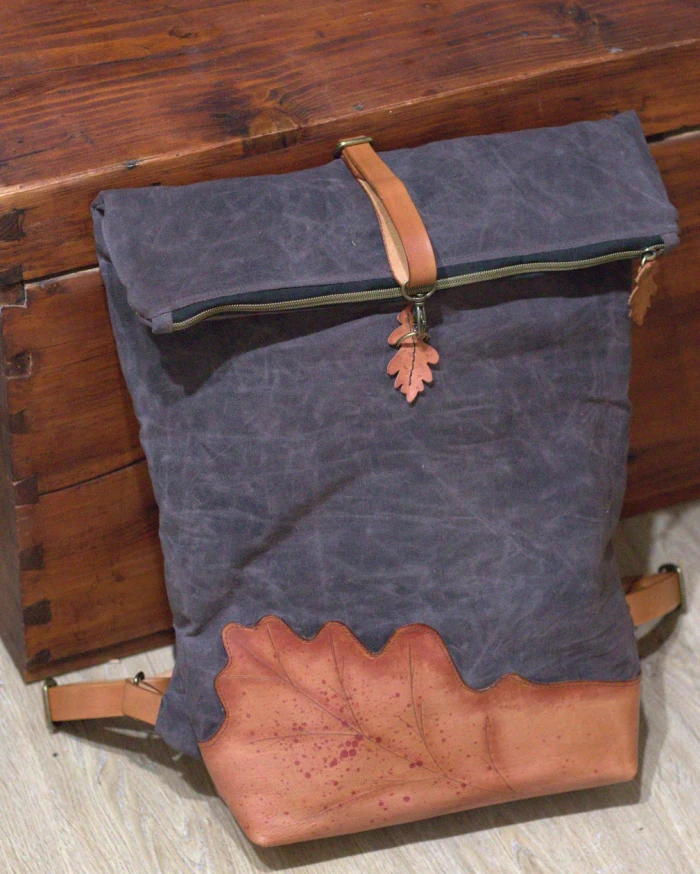 • Kombinace třísločiněné, ručně barvené a zdobené kůže + 100% bavlněné voskované plátno